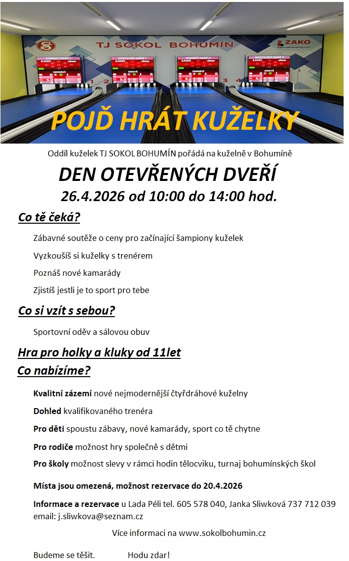 Přijďte si vyzkoušet tuto hru na naši novou moderní kuželnu se špičkovou technologii. Den otevřených dveří organizujeme za účelem, abychom vám dali možnost nahlédnout a vyzkoušet si kuželky. Abychom do našich řad přitáhli zájemce o tuto hru. Kuželky se dají hrát od 11 let až do seniorského věku. Zájemci o návštěvu dne otevřených dveří, hlaste se na tel. 605 578 040 (Lada Péli), nebo 737 712 039 (Janka Sliwková), případně na email: j.sliwkova@seznam.cz do 20.4.2026.